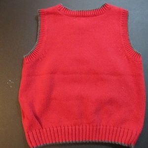 Greendog boy's red Santa Puppy sweater vest with crew neck and gray edging around ribbed neck, arm openings, and hem