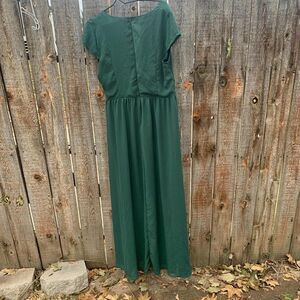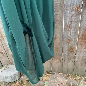 Gorgeous green dress with crossbody front and gathered waist. Maxi length but under layer is shorter. No size tag but measures as a large. Some loose stitching on waist, see pictures. Measurements are done flat and are approximate.