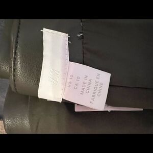 Green faux leather mini skirt. Two functional front pockets. A-line shape. Side button and zip for entry.