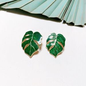 Green enamel leaf stud earrings in gold tone hardware