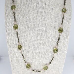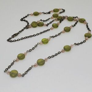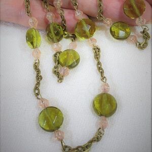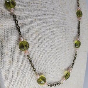 It is made with green and light pink glass beads and antique bronze plated chain.