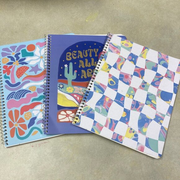 3 notebooks Abstract design Beauty is all around us Doodle graphic 1 SUBJECT NOTEBOOK 70 SHEETS, WIDE RULED 8.5 IN X 10.5 IN Our notebooks are made with paper containing 60% recycled fiber and printed with nontoxic soy-based ink.
