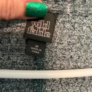 Cozy knit long-sleeve top with a relaxed V-neck. Front twist knot detail adds subtle shape. Lightweight, soft fabric for everyday wear. Neutral greenish hue pairs easily with many looks.