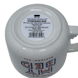 White mug with red and blue lettering