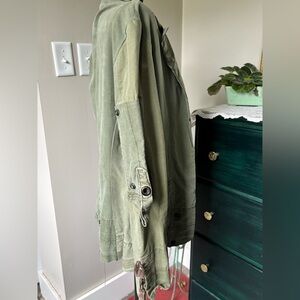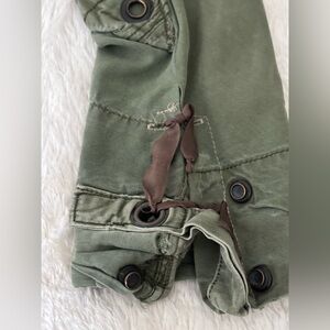 The Greg Lauren Army Tent Tux Jacket from 1/25/11 in size 2 is a unique and stylish garment crafted from vintage army tents. Its design features a rugged, yet sophisticated aesthetic, combining elements of military wear with high-end tailoring. The fabric showcases a distinctive texture reflecting its history. The jacket includes classic tuxedo element, a tailored fit, all while embracing an avant-garde flair. The materials introduces a blend of earthy tones, making it a standout piece for both casual and formal occasions. Please see measurements for fit.