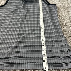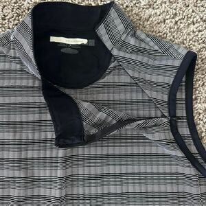 Grey and black striped sleeveless collared golf shirt with zippered collar.