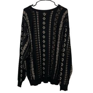 Gently worn long sleeve pullover sweater from Greg Norman Collection in a predominantly black colorway with allover cream, brown, and gray geometric pattern detailing.