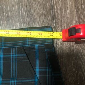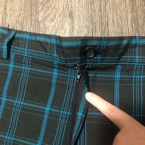 These are a fantastic pair of Greg Norman for Tasso Ella men's golf shorts, designed for comfort and performance on the course. They feature a striking black and electric blue plaid pattern that adds a modern flair to classic golf attire.