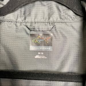 The jacket features the iconic, multi-colored Greg Norman shark logo embroidered on the back of the neck, and matching silver shark logo zipper pulls. It has a high collar, two convenient zippered side pockets, and an adjustable drawstring at the hem. This men's medium jacket is in great condition and ready for its next adventure.