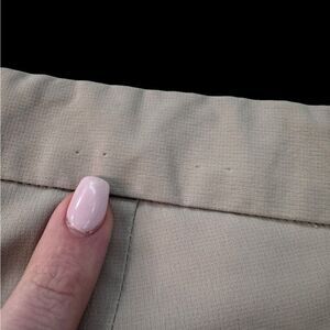 Dressy/silky feel. 9.5” inseam, 36” waist. Some small holes in the waist band from the store tags. No holes, some signs of general wear (small threads by pockets). No stains.