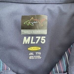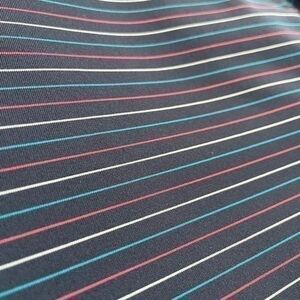 Greg Norman navy blue polo golf shirt with lighter blue, white and pink micro stripes. Made of polyester spandex performance fabric. There is an embroidered golf logo on the sleeve but I’m not sure exactly what it is for. Measurements are approximate and taken rolling flat: 32 inches from shoulder to hem and 25 inches from armpit to armpit