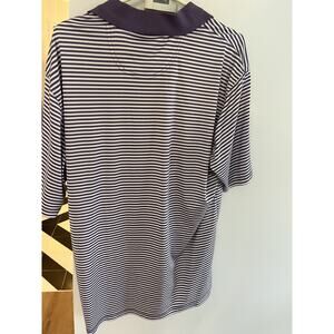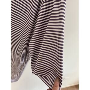 Purple striped. Polyester. Excellent condition. 22" pit to pit, 31" long shoulder to hem, 10" sleeve shoulder to end.
