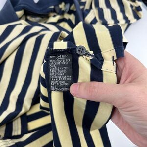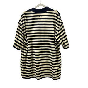 Classic striped polo shirt, featuring a navy and beige horizontal stripe pattern. This short-sleeved polo has a traditional collar and a three-button placket. The shirt also features Play Dry moisture-wicking technology, designed to keep you cool and comfortable. The design is simple and versatile, making it suitable for various casual occasions.