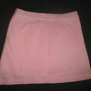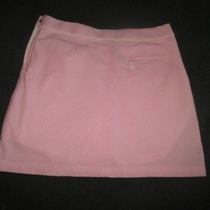 This is not available elsewhere. Please people. The low ball offers are getting so old. If you can pay the fair price please just disregard the item. Greg Norman Perefect Fit internal adjustable tabs preppy classic pink white seersucker cotton skirt with light satin like shorts under. So adorable. Looks barely used. Near perfect. see last picture for measurements. Perfect for most golf courses. So cute. Wish I was taller.!