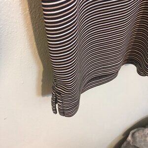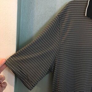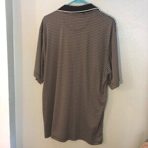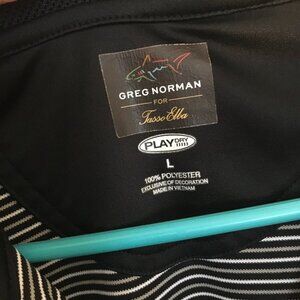 Men's Greg Norman collection polo shirt, three front button closure, size Large. Gray, black and white striped. No holes or flaws, good used condition. Has the Greg Norman logo on the left sleeve.