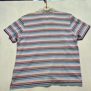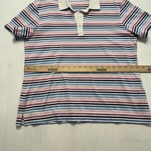 Add some sporty style to your wardrobe with this Greg Norman women’s polo shirt in size XL. This shirt features a bold multicolor stripe design in pink, blue, white, and navy tones, with a clean white contrast collar and a 3-button placket. Lightweight and breathable, it’s perfect for golf, tennis, or casual everyday wear.