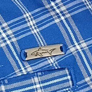 Greg Norman for Tasso Elba golf shorts. The blue and beige stripes offer a classic look. Size 32.