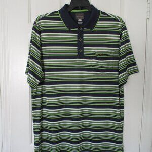 Greg Norman for Tasso Elba Mens S/S Play Dry Golf Polo Shirt. Size Large. Armpit-to-armpit 23", Length 31". 100% Polyester in Navy/Lime Green Stripe (Seattle Seahawks colors). New w/o Tags, suitable for gifting.