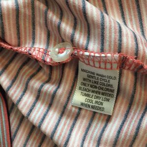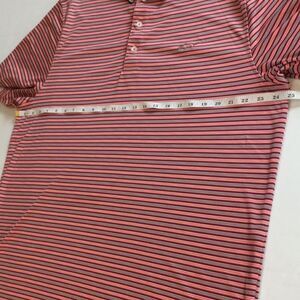 Greg Norman for Tasso Elba Play Dry Sz XL. Salmon (like a coral colored) striped. In excellent used condition. Great shark logo detail is multicolor in muted earthtones. Measurements are in photos.