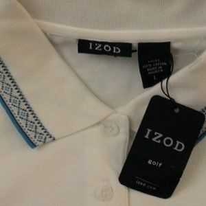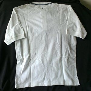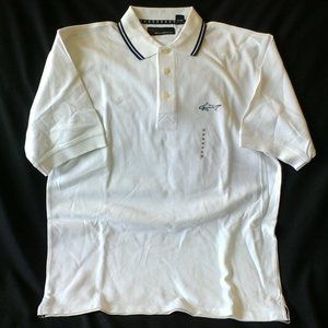 Greg Norman white polo shirt with black trim on color. Size M; 100% cotton. Made in Thailand. Machine wash cold, gentle cycle; tumble dry low. Measurements: 20.5" across the shoulders; 11" sleeve; 29" length from neckline to hem.