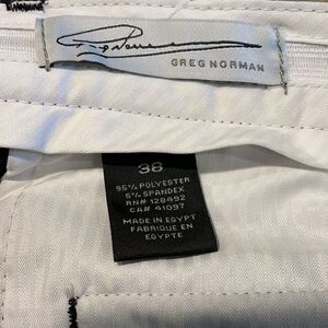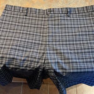 Like new! Polyester shorts by Greg Norman with signature fish on the back pockets. No issues. Plain front (no pleats). Inseam 10”