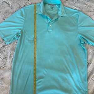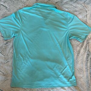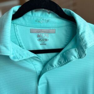 Mint/Teal Blue 100% Polyester VERY SOFT MATERIAL golf shirt. Collared, short sleeve with 3 button front