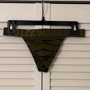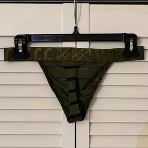 Gregg Homme Encore Thong in green with mesh stripes. Size tag removed, but appears to be Small. May fit larger. This thong is made of ultra soft and stretchy micro polyamide fabric in alternating opaque and see-through stripes with an enticing shimmer effect.