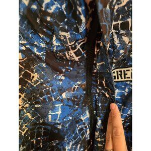 Grenade Snowboard Ski Jacket Mens Parka Jacket Shell w/Hood All Over Print Sz Medium 2 front side zippered pockets . IN good pre-owned condition see picutres above.