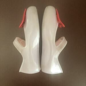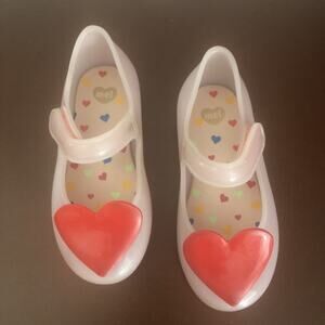 Grendene (the makers of Mini Melissa) mel red heart decal Mary Jane style shoes toddler size 8. Color is blush pink. Made in Brazil. GUC for some discoloration/scuffs on the heart and general wear but still in great shape. So perfect for Valentine's Day (or any day really) or a queen of hearts costume.