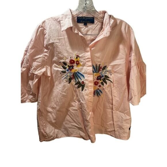 Lightweight pink blouse with intricate floral embroidery and ruffle sleeves, offering a feminine and elegant touch to casual or formal outfits.