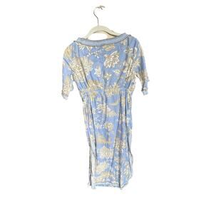 Style & Print: Blue base with cream/beige floral print, V-neckline, midi length, short sleeves.
