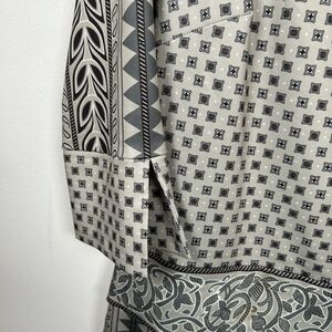 Introducing a stunning Gretchen Scott Border Jersey Shift Dress in a beautiful neutral color, perfect for any occasion. This dress features a unique Kanga Forpe print and is made from a comfortable polyester blend jersey fabric. The boat neck and 3/4 slit sleeves add a touch of elegance, while the pullover closure and knee-length hem make it easy to wear and versatile for any event.