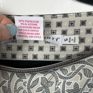 Whether you're traveling, attending a party, or simply dressing casually, this dress is sure to turn heads. The geometric pattern and colorful flower design add a touch of artistry, while the stretchy fabric ensures a comfortable fit. Hand wash only to keep this dress looking its best. Available in size small, this classic shift dress is a must-have for any fashion-forward woman's wardrobe.