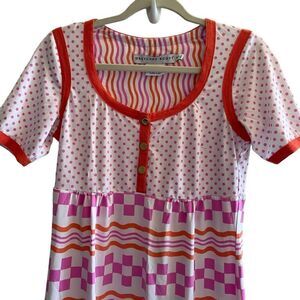 This vibrant colored pink, orange and white short sleeve shirt dress is by Gretchen Scott. The pullover dress features polka dot, checkered squares and stripes. It is made of a silky stretch fabric. Women’s size small.