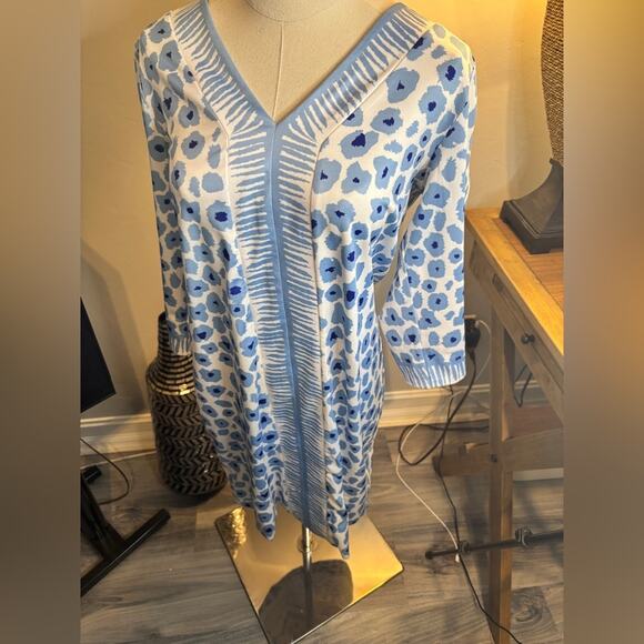 Elegant dress with a blue and white pattern. Perfect for any occasion.