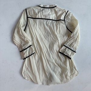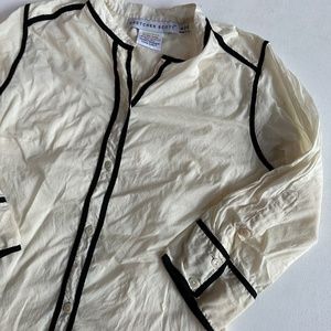 Elegant cream top with black trim. Long sleeves with button cuffs. Stylish and versatile.