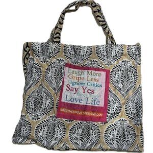 Elegant lightweight gauze tote with black and tan floral design. Features a motivational quote patch. Ideal for daily use. Stylish bag by Gretchen Scott Designs featuring a tan and black pattern. Different pattern on both sides - Perfect for everyday use with a positive message design! Cotton Voile Fabric