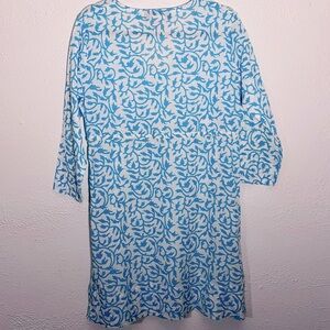 The Gretchen Scott Designs Jersey Tunic Dress in blue is a stylish and comfortable option for women looking for a chic summer outfit. Made from soft cotton material, this tunic features a periwinkle character design that adds a touch of elegance to the piece. Perfect for resort wear or casual outings, this designer tunic is a versatile addition to any woman's wardrobe. Its small size makes it ideal for a flattering fit, while the tunic style offers both comfort and style for the warmer months.
