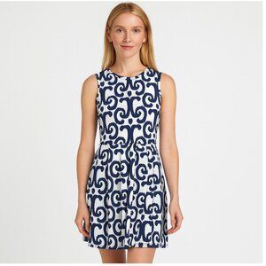 * Coral red with blue embroidered detail at neckline, sleeves, and hem