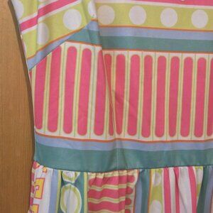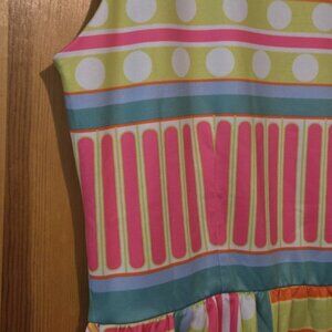 The Gretchen Scott Dress in size XXS is a stylish and vibrant choice for a date night. Does also include belt! This sleeveless dress features a geometric pattern in hot pink and is made from a polyester-spandex blend for a comfortable fit. The V-neckline and knee-length silhouette make it perfect for casual occasions, while the pullover closure and lightweight fabric ensure easy wearability. Additionally, the multicolor design adds a playful touch to the overall look, making it a stand-out piece for any summer wardrobe.