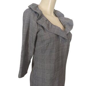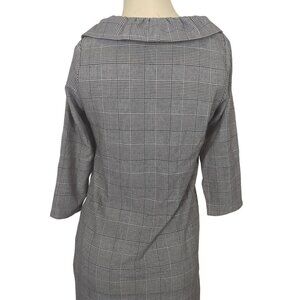 A versatile and sophisticated shift Gretchen Scott dress featuring a classic plaid Prince of Wales check pattern, 3/4 sleeves, and an elegant ruffle collar. Ideal for polished workwear or semi-formal settings.