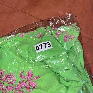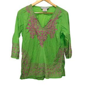 Gretchen Scott Green Cotton Tunic Top Embroidered V-Neck 3/4 Sleeves L boho