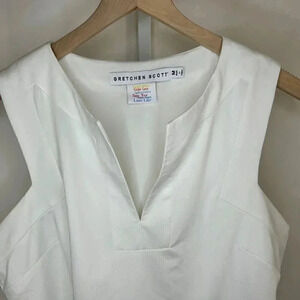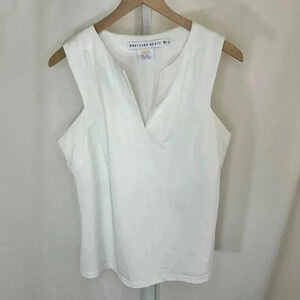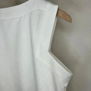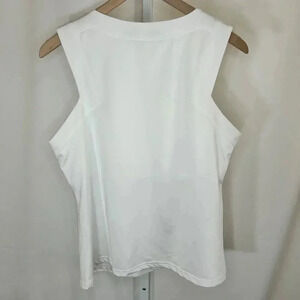 Solid white V-neck tank top with unique cut out details at shoulders.