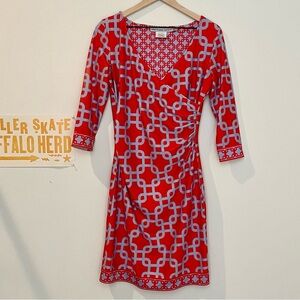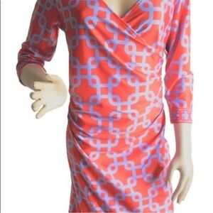 Gretchen Scott Unchained Crossover Faux Wrap Sheath Dress Preppy. Colors are coral and blue. Preppy print with V neck and flattering faux ruching on both sides of tummy. No visible flaws and 3/4 sleeve. Perfect for church, brunch, travel, or business career wear.