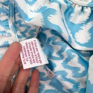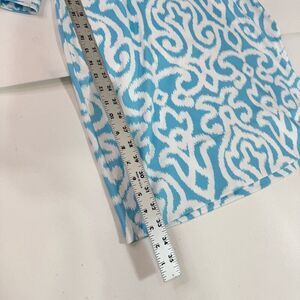 Gretchen Scott Shift Dress Womens Medium Blue Jersey Geometric Ruffle Resort