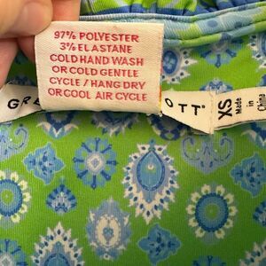 Ruffle neckline. 3/4 sleeves. Green with blue floral pattern.
