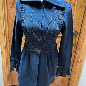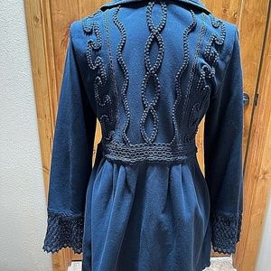 Stunning Navy Blue Gretty Ziegler Knit Jacket/Sweater/Duster with cord detailing on front and back. Sleeves end in crocheted cuffs. 4 buttons adorn front. Gathered waist make this jacket perfectly fitted. Been kept in a storage bag for several years.