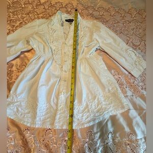 Gretty Zueger SiZe M Vintage White cotton blouse, embroidered, This crisp white blouse showcases a romantic style with its ruffled front and mandarin collar. The 3/4 sleeves add a touch of elegance, making it a versatile piece for any occasion. Its flowing fit ensures comfort and style throughout the day.