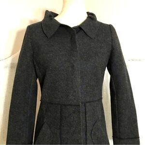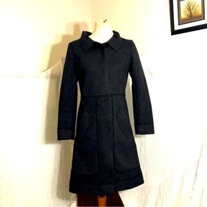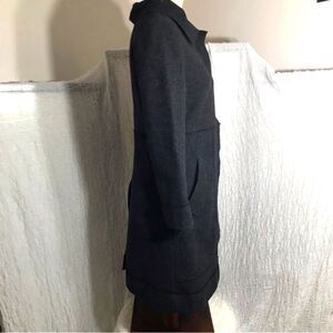 Beautiful structured Grey winter coat. Good quality 100% Wool. Front button closure. Two pockets on the side front. Brand and size are unavailable ( tag was taken off ). Best guess it’s a size small. Pre-owned in good condition. Please refer to pictures and measurements for best description, condition verification, and fit.