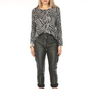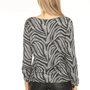 Lightweight scoop-Neck Sweater top with Long Sleeves That May Be Rolled Up And Cuffed. Features a zebra print , cozy , comfy +glam, Machine Washable